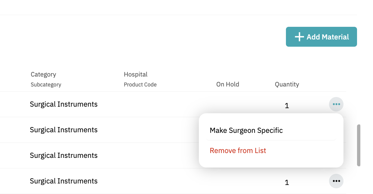 • Click the three dots next to the item, then click 'Make Surgeon-Specific'. Note: This will disconnect the item from the standard list.