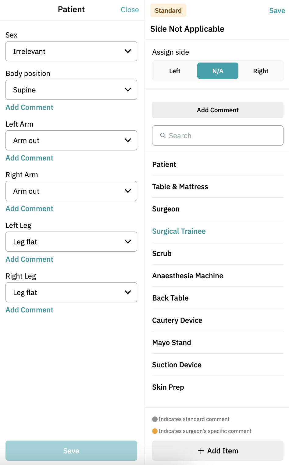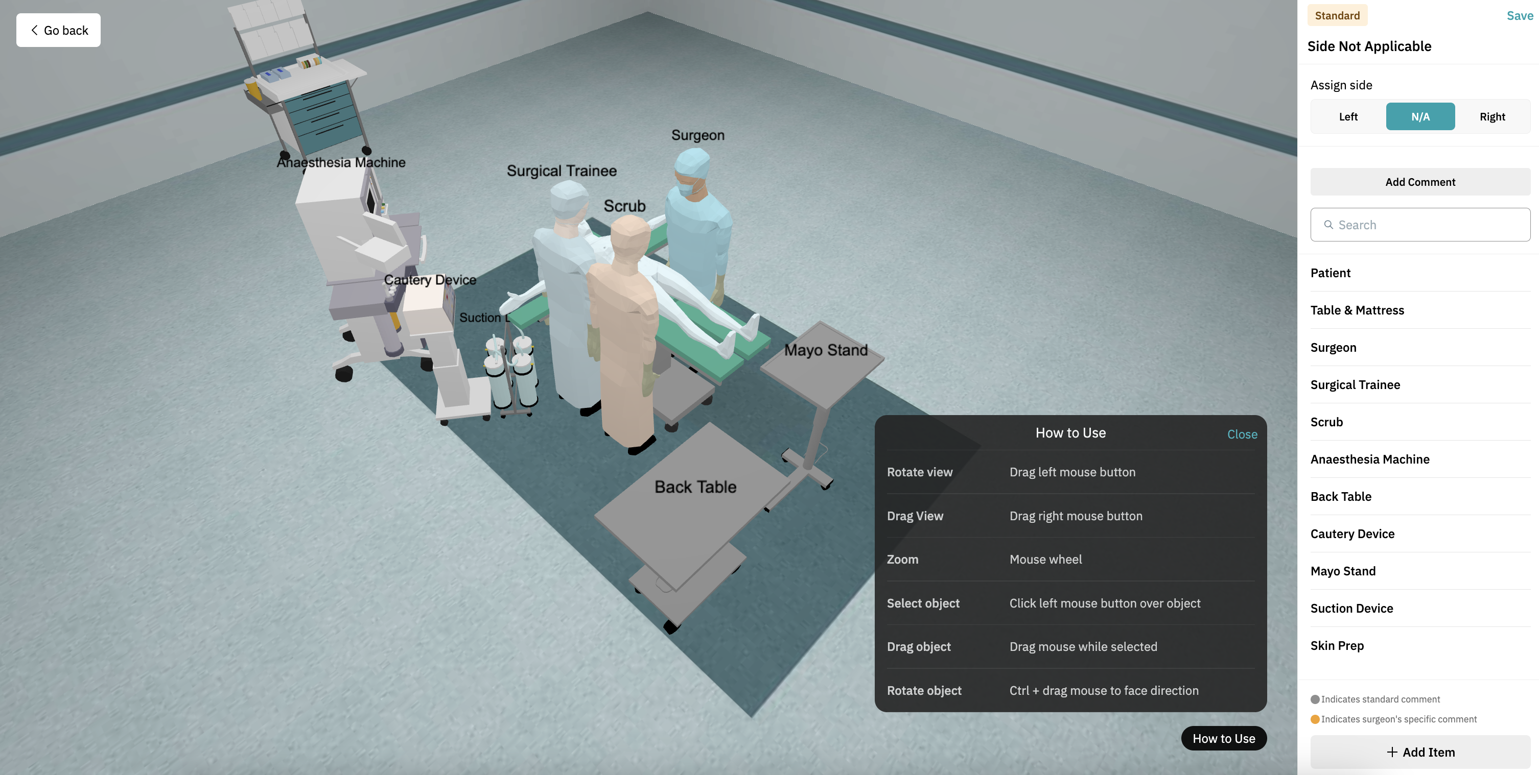 - Choose side: Left, Right, or Not Applicable: Some procedures require the surgeon to operate from a specific side. You can set up the 3D OR for: