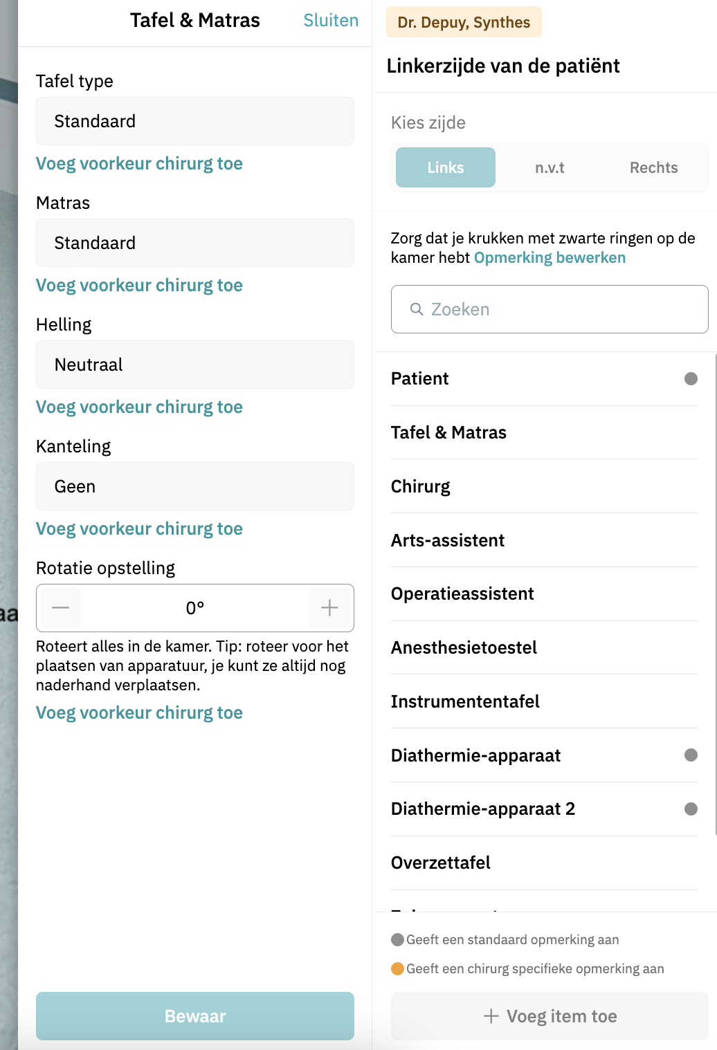 - 3D OK-opstelling en patiëntpositionering: Je kunt voorkeuren van de specialist toevoegen door een comment toe te voegen. Klik op het item en vervolgens op 'Voeg voorkeur chirurg toe'. Vergeet niet op Bewaar te klikken.