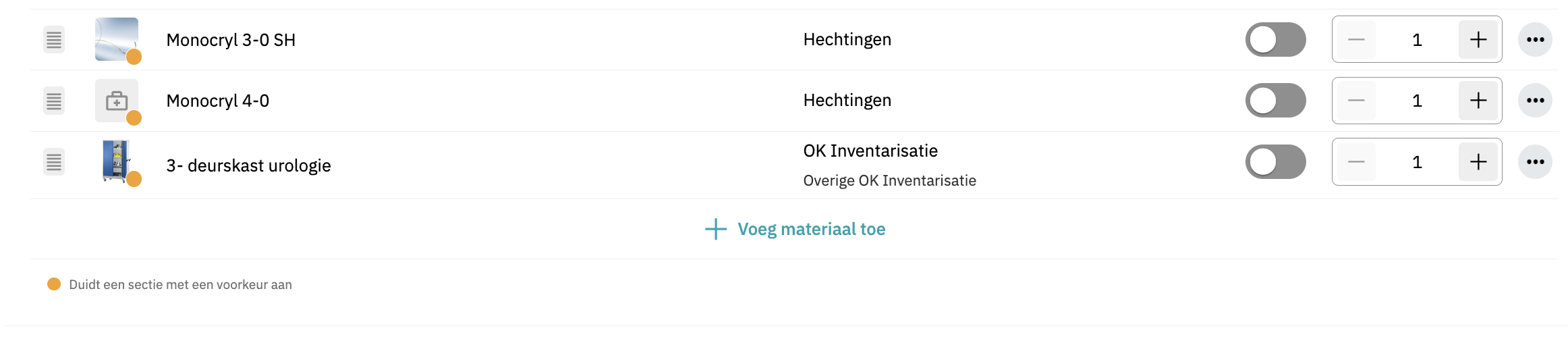 - In het overzicht van materialen zie je dat een materiaal een voorkeur is van een specialist door de oranje stip.