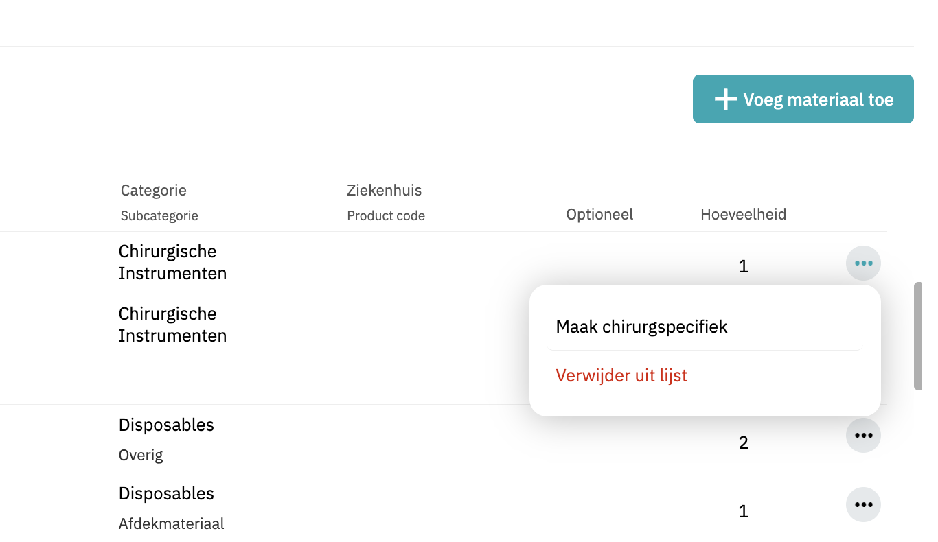 - Een bestaand materiaal omzetten in een voorkeur voor deze specialist. Om dit te doen klik je op de 3 puntjes rechts van het materiaal. Klik vervolgens op 'Maak chirurgspecifiek'. Let op: Zodra je het materiaal aanvinkt als chirurgspecifiek koppel je het los van de standaard materiaallijst.